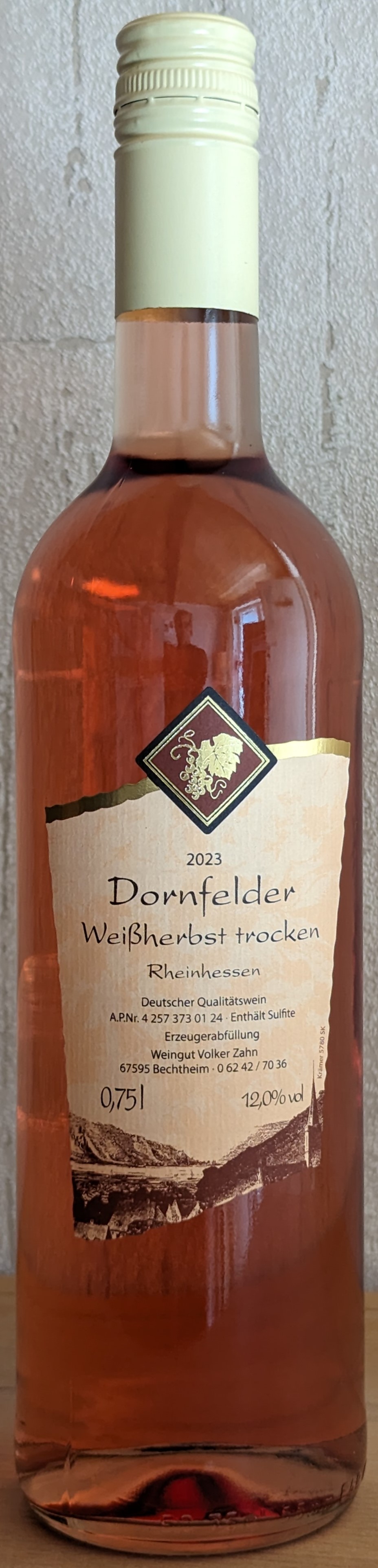23-01 2023er Dornfelder Weißherbst Qualitätswein TROCKEN Säure: 5,5g/L Alkoholgehalt: 13,5% vol 6,93€ pro Liter Enthält Sulfite
