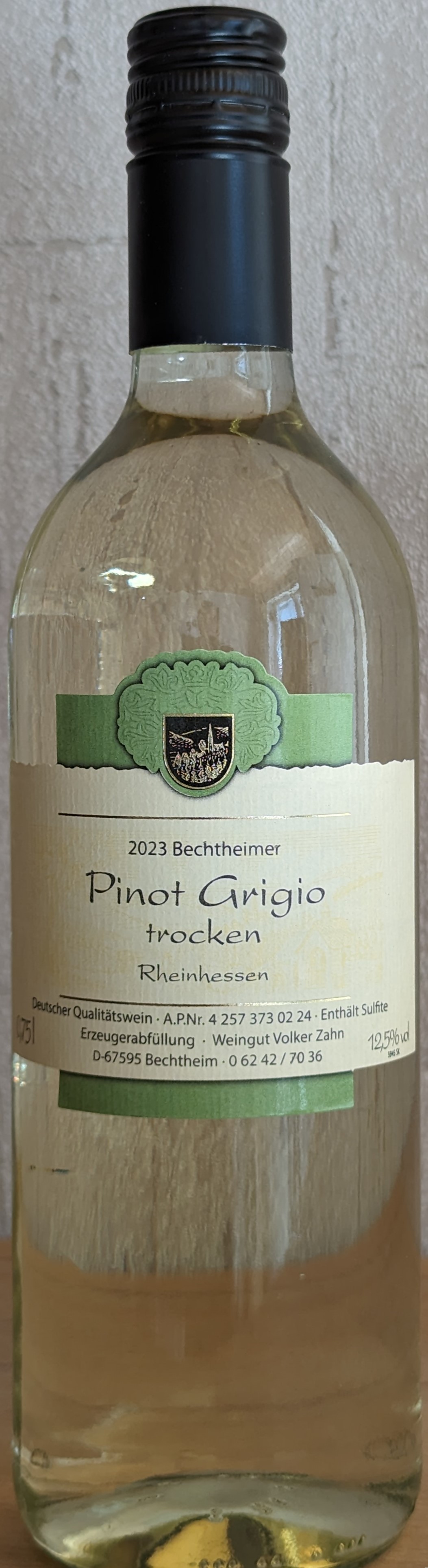23-02 2023er Bechtheimer Pinot Grigio Qualitätswein Säure: 4,6g/L Alkoholgehalt: 12,0% vol 7,47€ pro Liter Enthält Sulfite