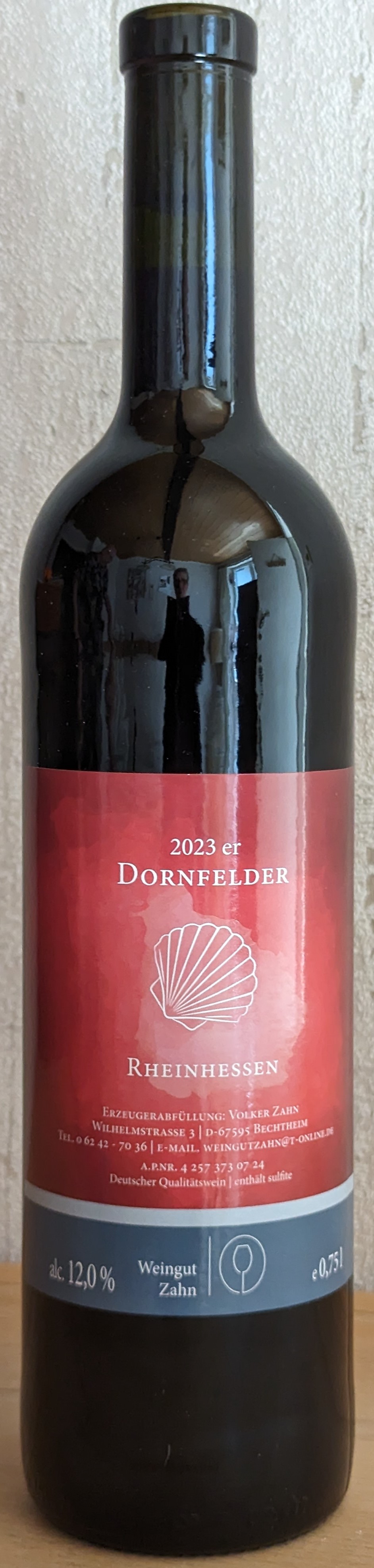 23-07 2023er Dornfelder Qualitätswein Säure: 5,8g/L Alkoholgehalt: 12,0% vol 7,47€ pro Liter Enthält Sulfite