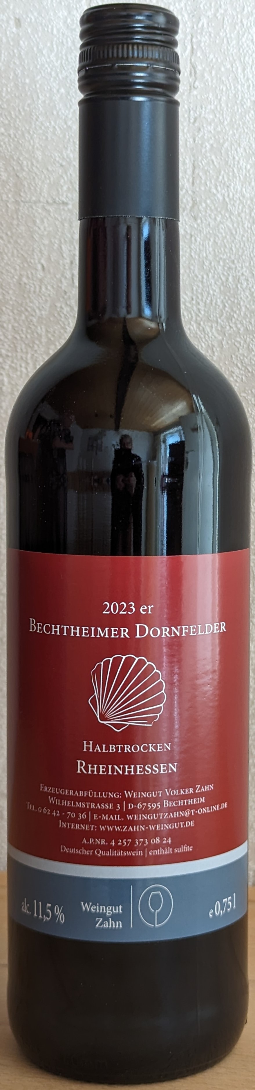 23-08 2023er Bechtheimer Dornfelder Qualitätswein HALBTROCKEN Säure: 5,7g/L Alkoholgehalt: 12,0% vol 7,07€ pro Liter Enthält Sulfite