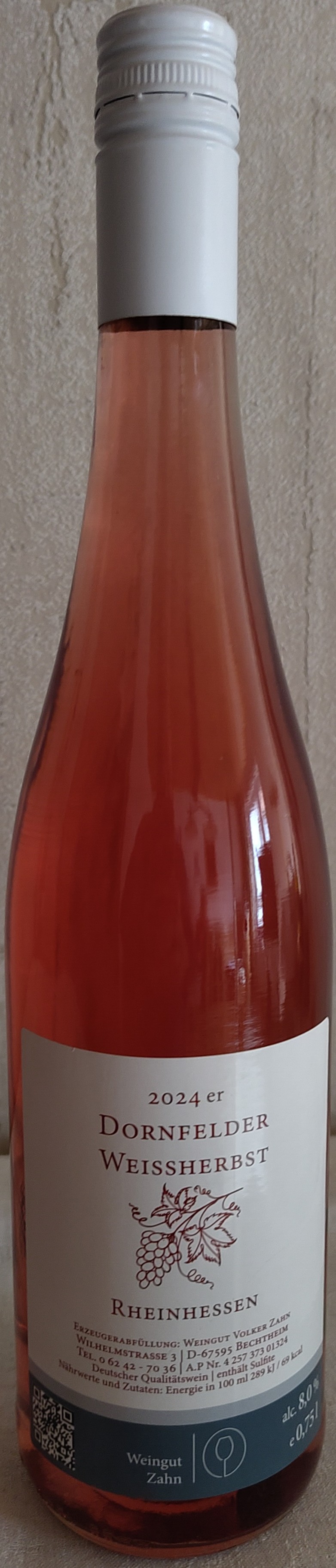 24-02 2024er Dornfelder Weissherbst Süß Säure: 5,4g/L Alkoholgehalt: 8,0% vol 6,93€ pro Liter Enthält Sulfite