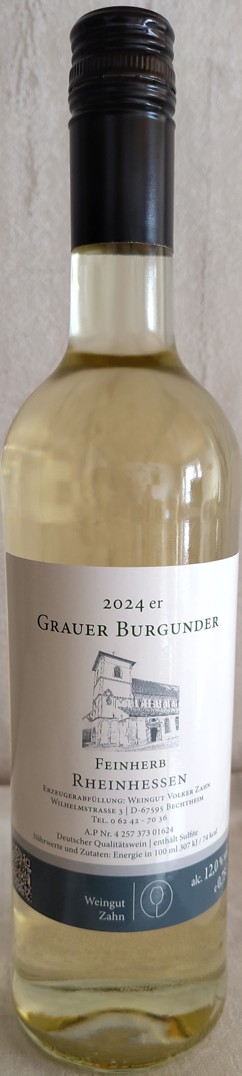 24-04 2024er Grauer Burgunder Feinherb Qualitätswein Säure: 5,7g/L Alkoholgehalt: 12,0% vol 7,20€ pro Liter Enthält Sulfite |