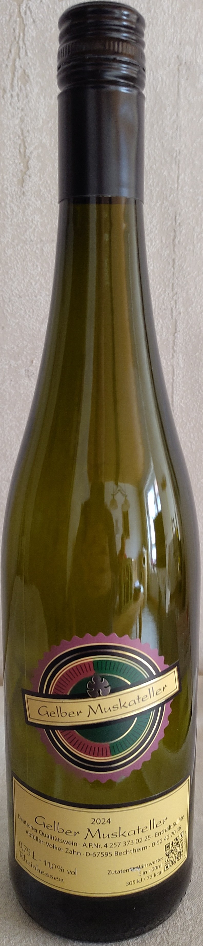24-06 2024er Gelber Muskateller Qualitätswein Säure: 5,9g/L Alkoholgehalt: 11,0% vol 7,47€ pro Liter Enthält Sulfite